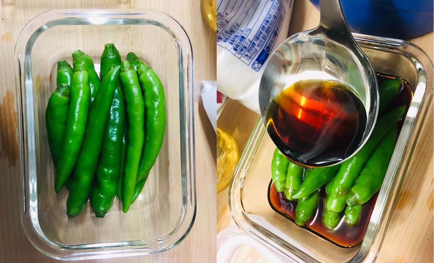 6. 유리용기나 밀폐시킬 수 있는 용기를 준비해서 고추를 넣고, 간장도 넣어준다!
